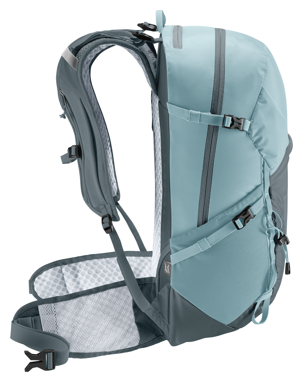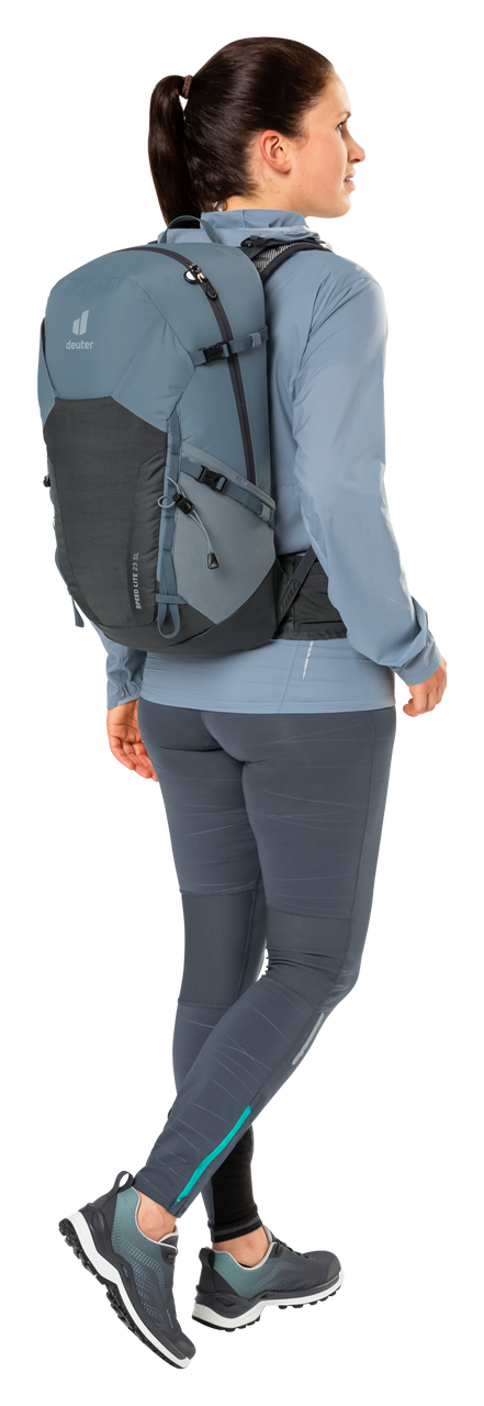 Speedy, light and sustainable thanks to deuter’s Lite back system, vest-style, perforated shoulder straps, supple hip fins, precision-adjustable sternum strap and 100% recycled, bluesign® certified body fabric. Designed for fast-paced hiking and trail running, side compression straps effectively reduce load wobble and enable full range of movement. While a pocket on the shoulder straps keeps everything that you need on the trail handy.