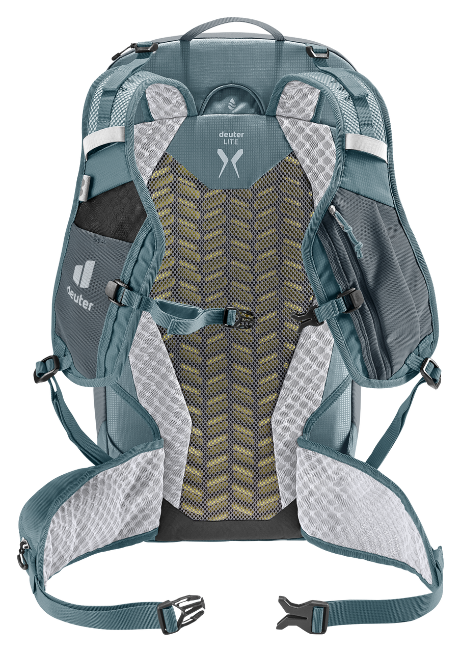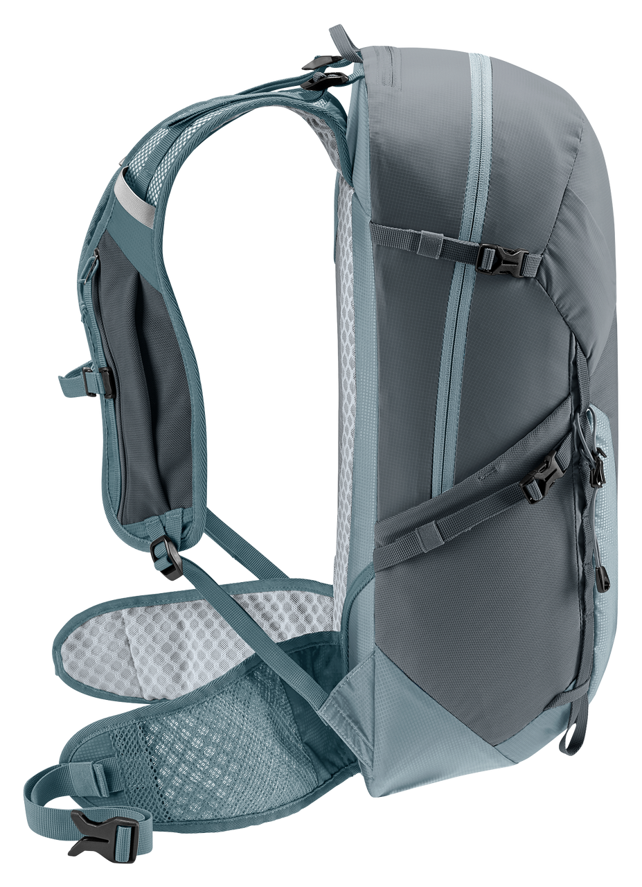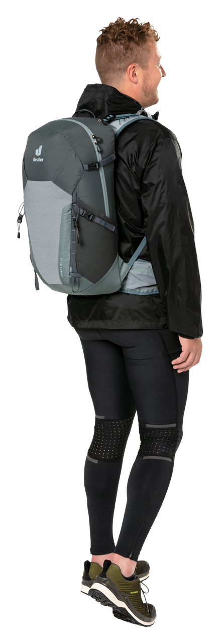 Speedy, light and sustainable thanks to deuter’s Lite back system, vest-style, perforated shoulder straps, supple hip fins, precision-adjustable sternum strap and 100% recycled, bluesign® certified body fabric. Designed for fast-paced hiking and trail running, side compression straps effectively reduce load wobble and enable full range of movement. While a pocket on the shoulder straps keeps everything that you need on the trail handy.